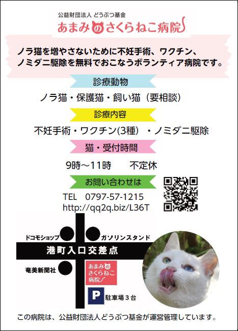 当日は、山口武雄院長、足立獣医(プロジェクトリーダー)、斎藤獣医(ボランティアリーダー)他スタッフがお迎え致します。