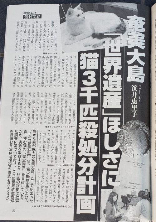 週刊文春 奄美大島「世界遺産」ほしさに猫3000匹殺処分計画(ジャーナリスト・笹井恵里子)​より抜粋