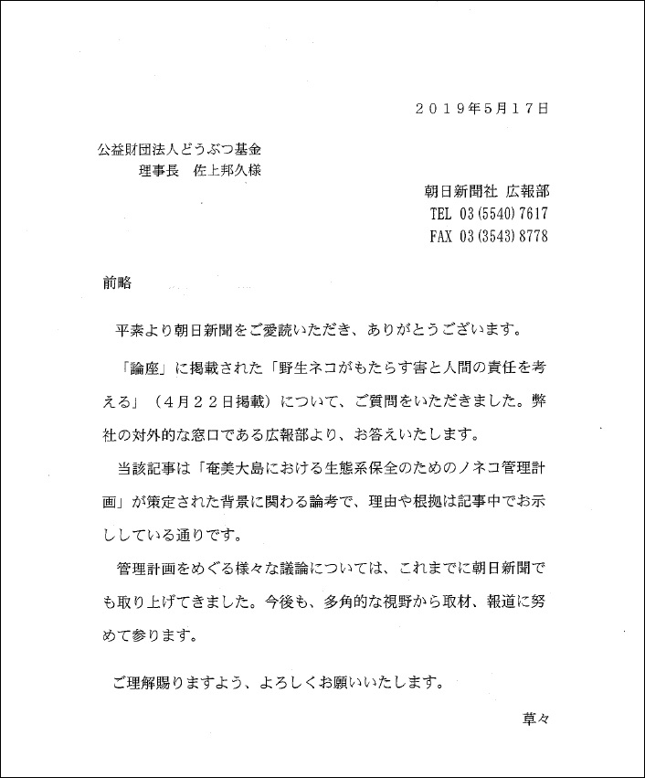 さて、去る4月22日、朝日新聞デジタル版「論座」に掲載されました、朝日新聞科学医療部記者・小坪遊さんの文章「野生ネコがもたらす害と人間の責任を考える:奄美大島で始まった『ノネコ管理計画』へのイチャモンに異議あり」に関しまして、朝日新聞社様の報道姿勢について申し上げたき儀これあり、お手紙を差し上げる次第です。
