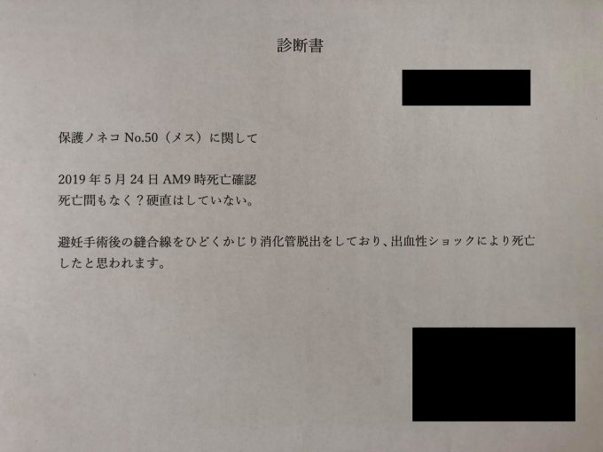 5月27日(月)   :  ねこ対協Bさんから遺体は送れないとの返信メールに、遺体の写真と診断書が添付され送られて来た。遺骨のみ送ってもらうよう依頼。