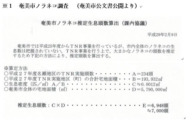 - 奄美大島ねこ対策協議会が行ったモニタリング(2020年度)によると奄美市には約935頭(奄美全体では2,586頭)のノラ猫が生息し90%以上がtnr済(不妊去勢手術済み)。