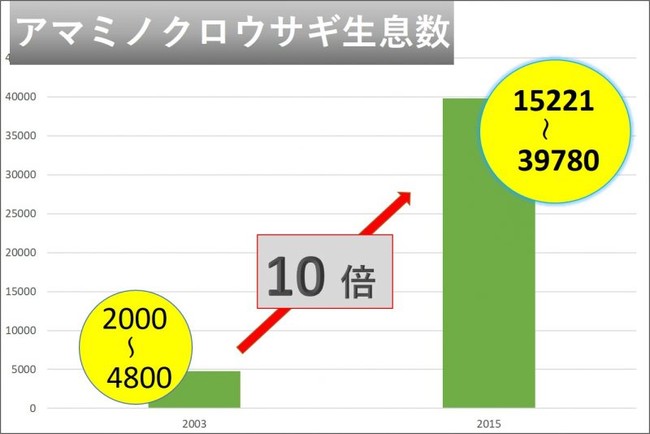 - アマミノクロウサギの推定生息数(奄美大島)は2003年(2,000~4,800頭)から2015年(16,580~39,780頭)と12年間で10倍近くまで回復した。この間、32,000頭のマングースの駆除が行われた。マングースの根絶が、アマミノクロウサギ激増の原因。