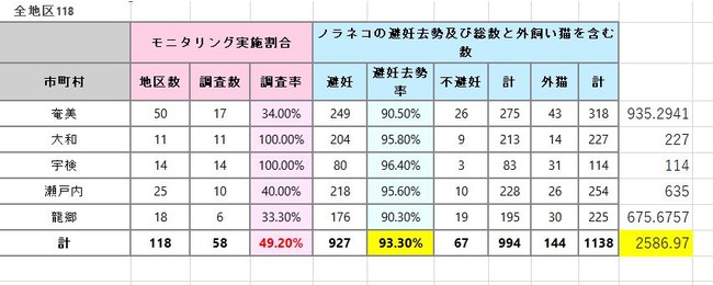 - 奄美大島ねこ対策協議会が行ったモニタリング(2020年度)によると奄美市には約935頭(奄美全体では2,586頭)のノラ猫が生息し90%以上がtnr済(不妊去勢手術済み)。