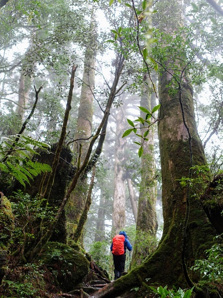 照葉樹林を抜け、巨樹の杉の間を抜けてきた道は、気づけば高山の植生の中を