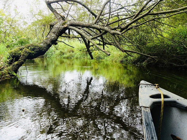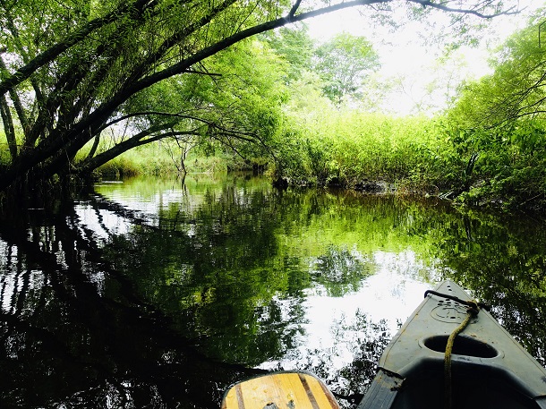 流れはほとんどなく、静かな水面。上流に向かって漕いでいても、