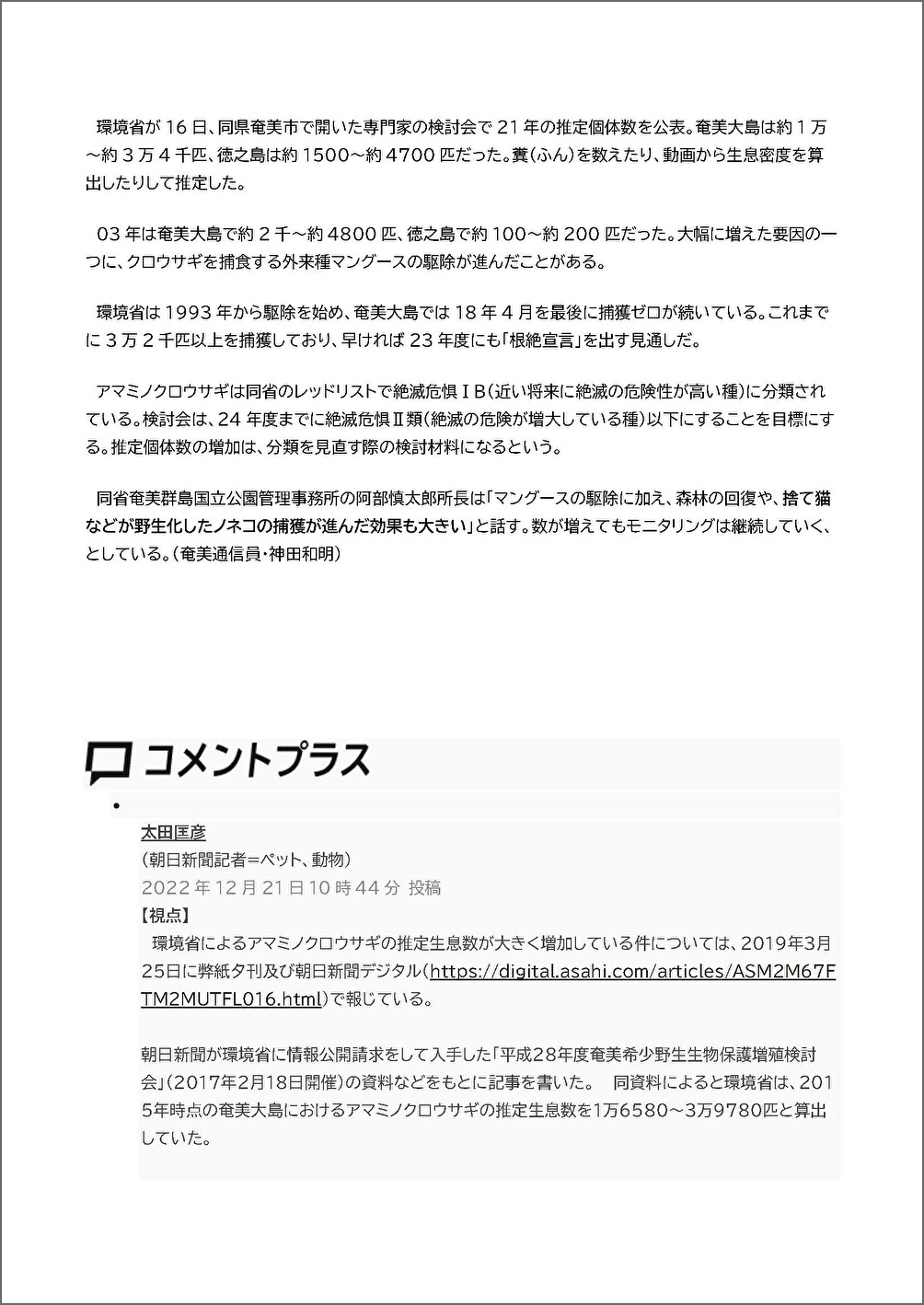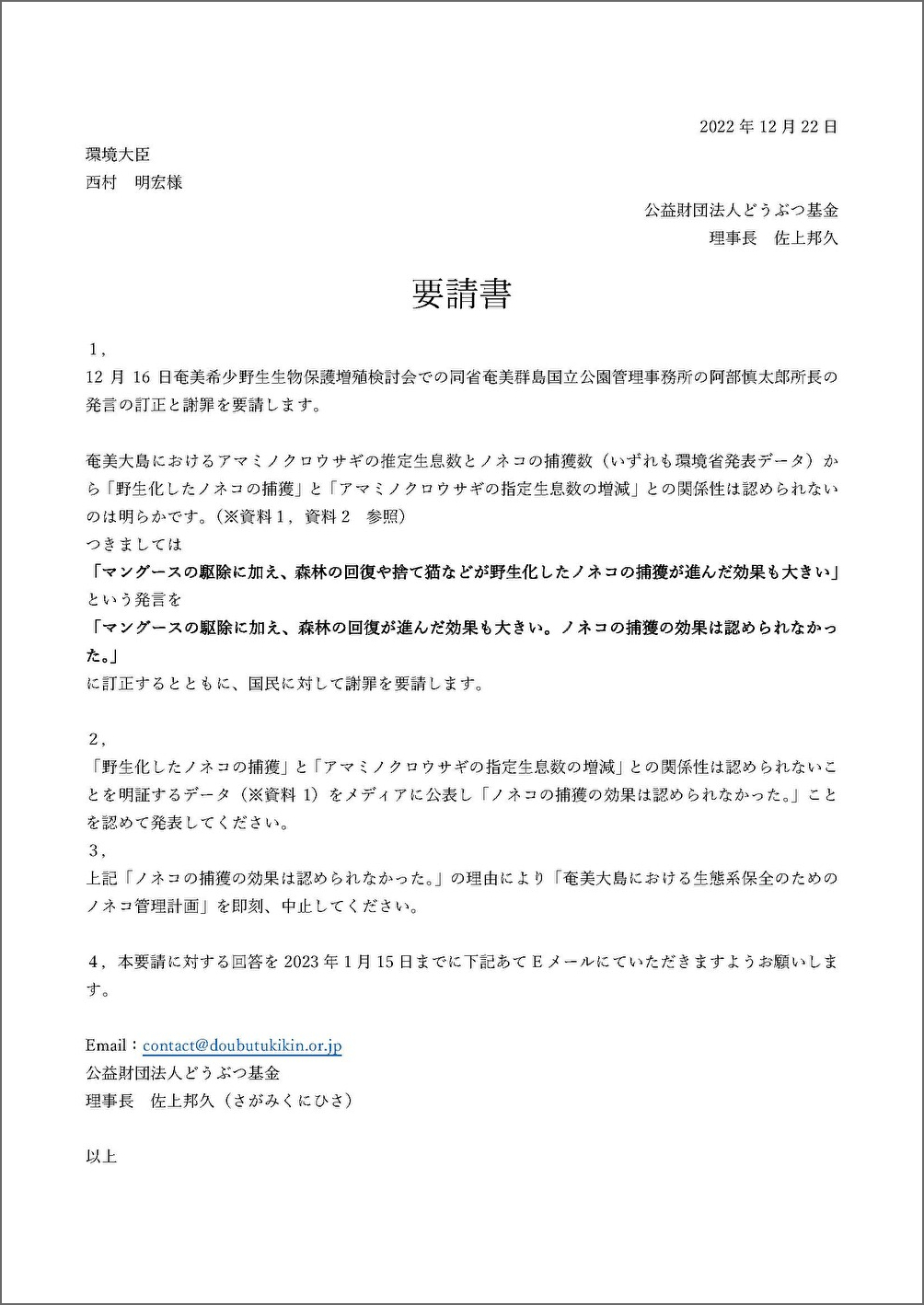 2022年12月16日の奄美希少野生生物保護増殖検討会における、同省奄美群島国立公園管理事務所の阿部慎太郎所長の発言について訂正および謝罪を要請するものです。