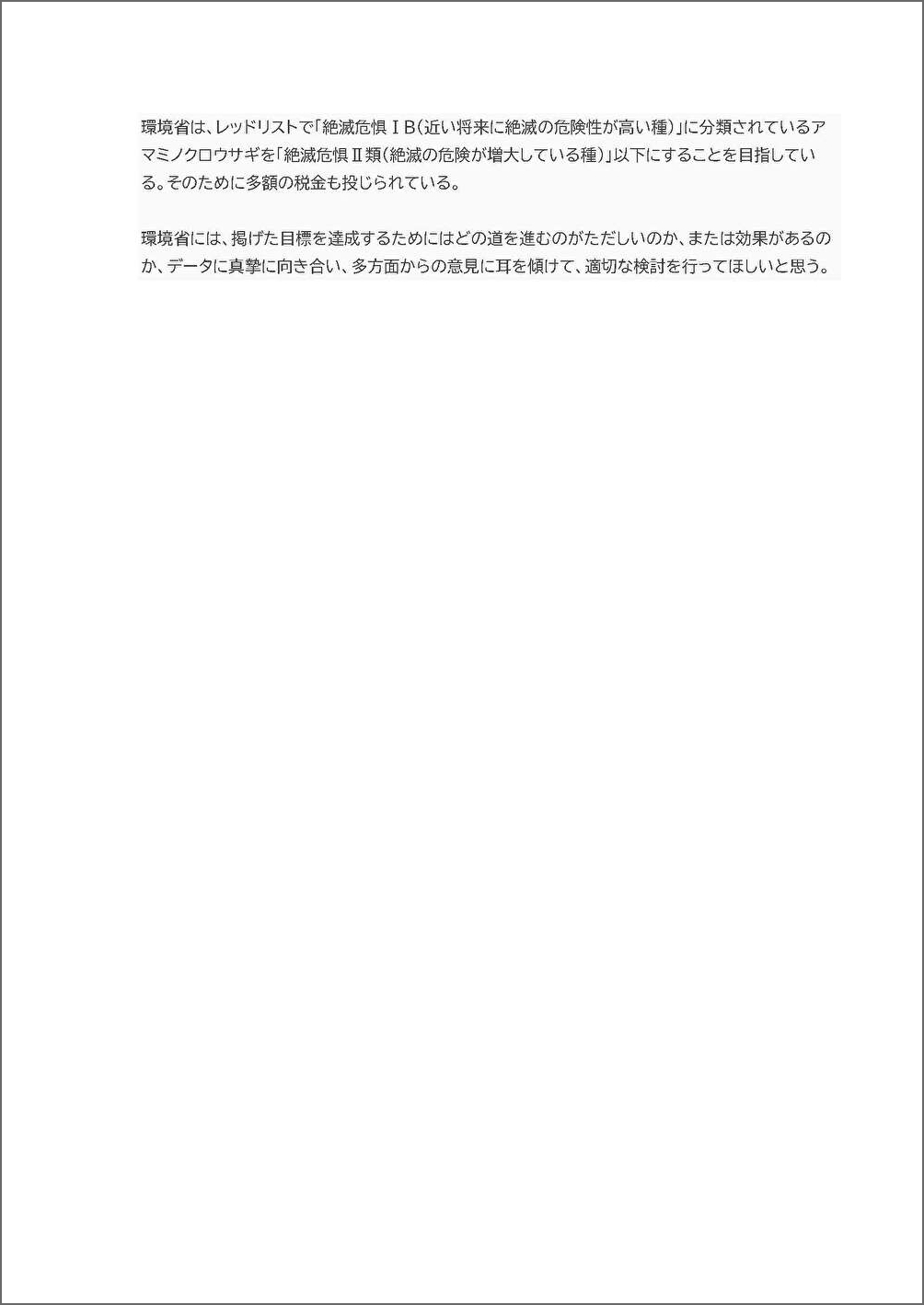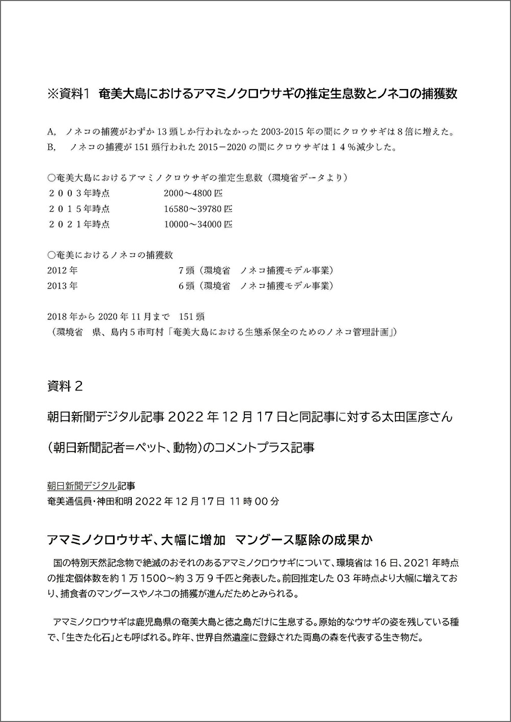 奄美大島におけるアマミノクロウサギの推定生息数とノネコの捕獲数(いずれも環境省発表データ)から、「野生化したノネコの捕獲」と「アマミノクロウサギの指定生息数の増減」との関係性は認められないのは明らかです(要望書添付の資料1、資料2参照)。