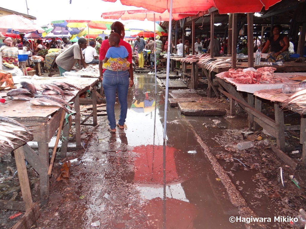 雨が降った後の市場(市内)はゴミの混じった水たまりができ、歩くのもたいへんです