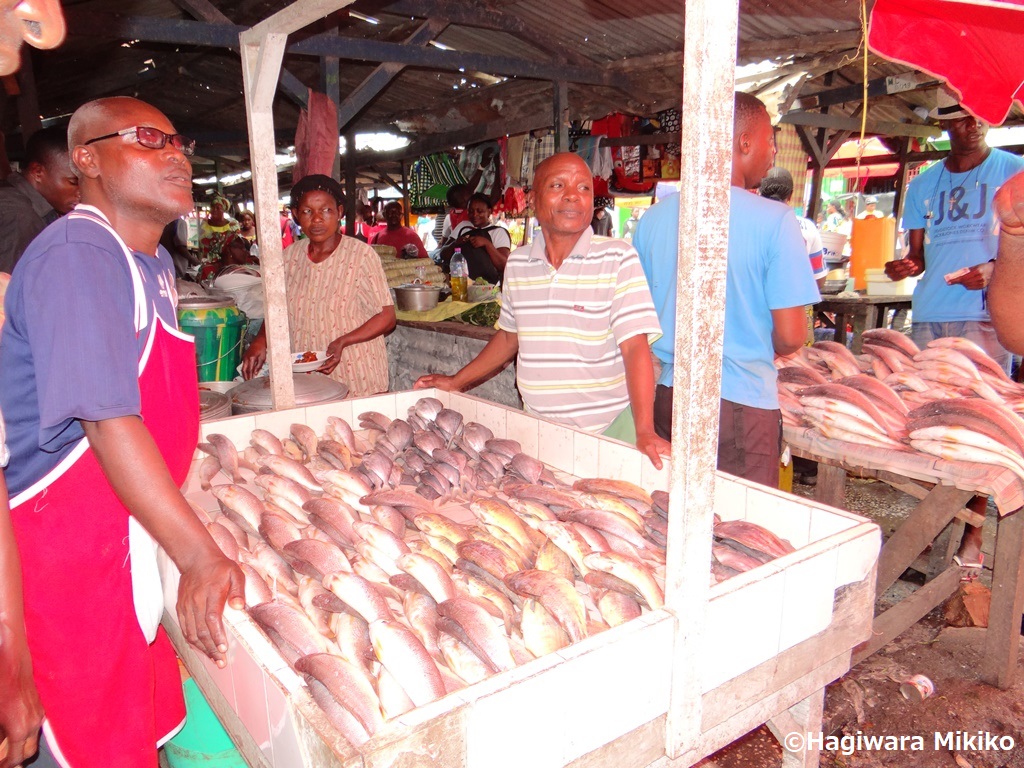 浜から市内の市場に持って行って売る小売人たちは、市場の木製の販売台の上に魚を置いて、時には砂をつけたりして、ハエもたかっている状態で売っていました。消費者にも「鮮度・衛生が大事」という常識があまり無いため、当たり前のことだったのです。しかもいよいよ魚がくたびれてくると、値段を下げて売らざるを得ないため、鮮度が悪くても安く買うのを好む消費者もいました。これにはまた別の担当コンサルタントの日本人が、ある市場でトライアルとして販売台をタイル製にし、氷を打って販売してもらおうとしました。ところがこの販売台の女性は、与えられた氷を飲み物を冷やして売るのに使ってしまったり、教えられたとおりに魚に氷を打たずに売っていて、コンゴ人がいかに「変わる」のが難しいかを知ることになりました。