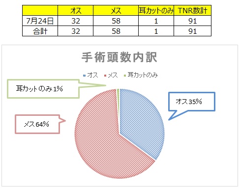 7月24日三重県動物愛護センター(あすまいる)で91頭の不妊手術が行われました。