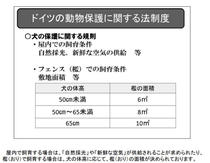 中央環境審議会動物愛護部会の「関係者ヒアリング」で、犬猫適正飼養推進協議会(会長=石山恒・ペットフード協会会長)による飼養施設に関する自主規制の一部が発表されました。ケージ(寝床)の大きさについて「高さ=体高×1・3倍」「幅(短辺)=体高×1・1倍」とされています。寝床とは別に生活スペースを設置するとされていますが、生活スペースの広さや生活スペースでの1日あたりの最低滞在時間は設置せずとなっています。つまり寝床と称した狭いケージに24時間閉じ込められていてもそれは数値規制の対象にはなりません。