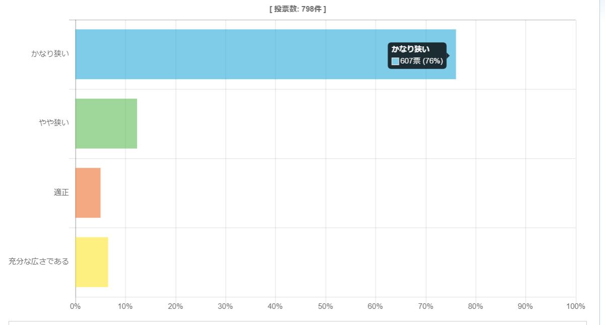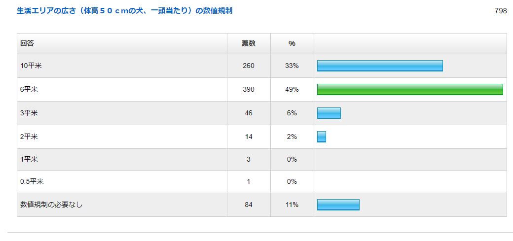 社会通念上の常識から考えて、寝床は生活エリア内に設置されているべきです。よって、生活エリアと寝床を別々に考えることに疑問を感じますが、今回は、あえて比較のために生活エリアと寝床が別れた犬猫適正飼養推進協議会による自主規制案の数値の適正度についてアンケートを行い、798名の方からご回答いただきました。