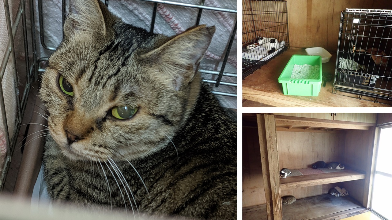 - 手術前は全ての猫が室内を自由に行き来していたが、譲渡に向けて慣れさせる目的があり、気性の荒い猫については大きめのゲージに入れて個別に餌を与えるようにしている。