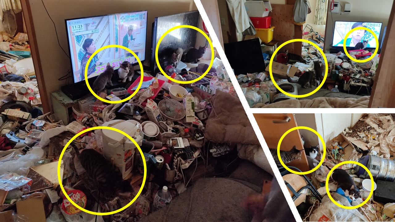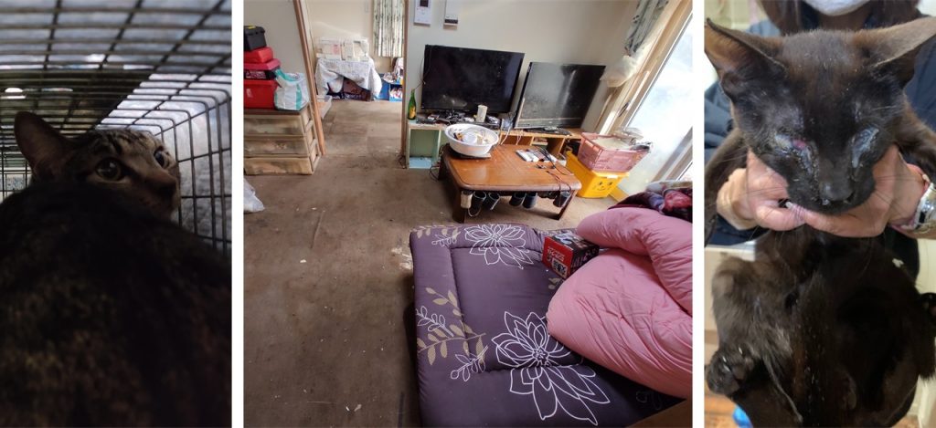 3. 当事者は病気により満足に働けていない状況。猫に対する必要な治療はできておらず、不衛生な状態で猫が増え続けている。おそらく数年以上前から多頭飼育崩壊の状態と推察される。