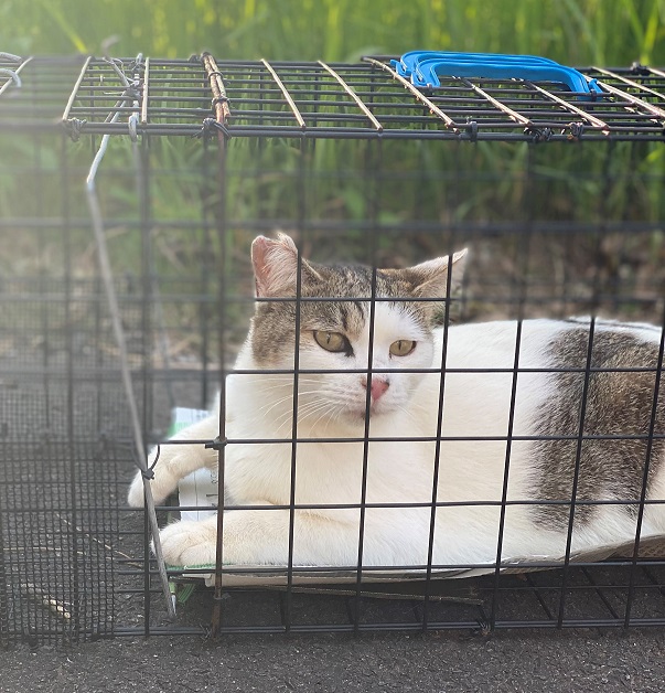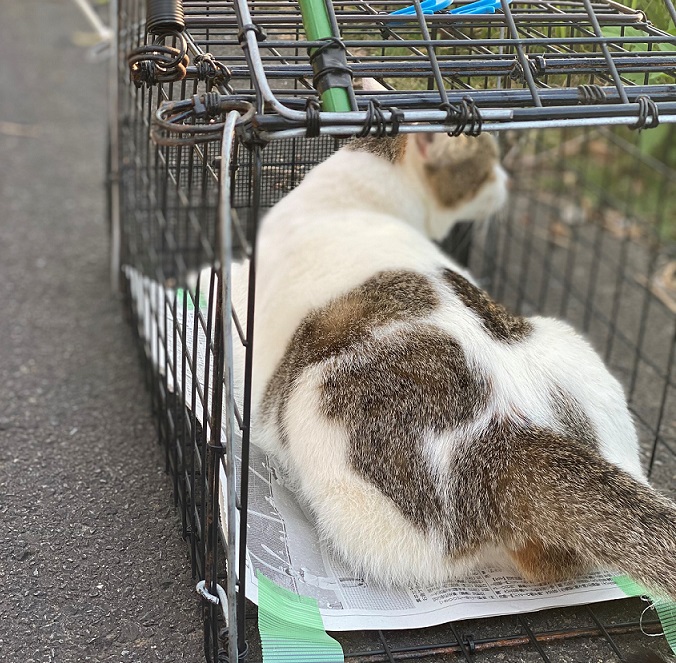 捕獲器に入ってくつろいでいる、先輩さくらねこでした!