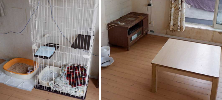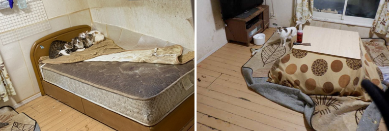 6. 現場確認時、強いアンモニア臭や壁の変色、床の糞の跡、清掃した大量の糞が入ったビニール袋等を確認。普段の衛生環境は立ち入り時よりも悪い可能性が高いこと、このまま放置すればさらに頭数が増えて生活環境が悪化する恐れがあることから支援が必要と判断。申請に至った。