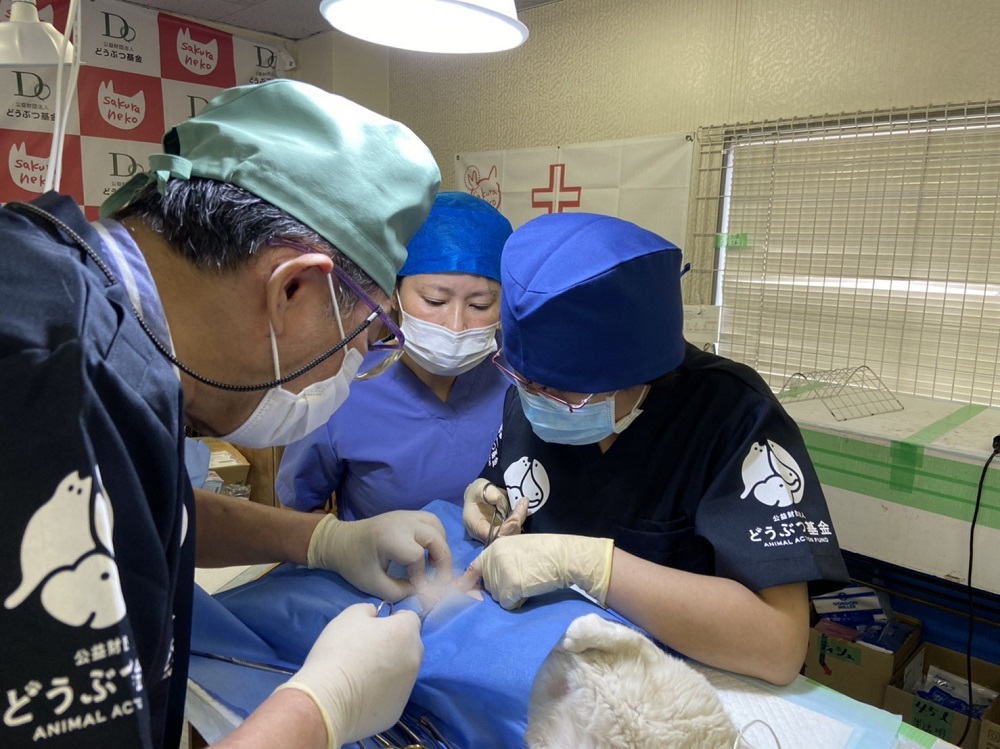 執刀する獣医師、現場に立ち会うボランティア、