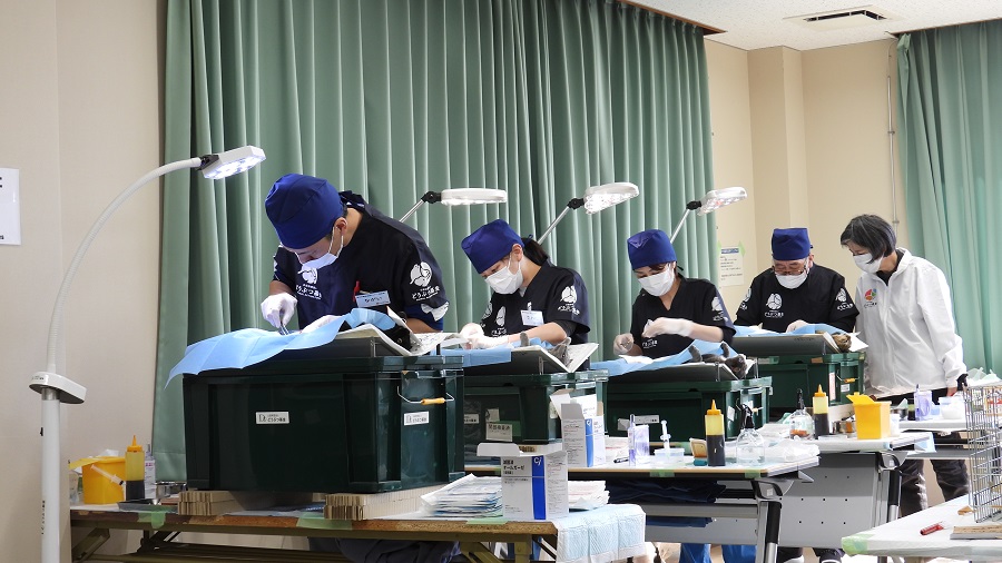 参加した4名の行政獣医師が山口獣医の指導のもと執刀を行っています。