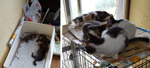 - 5、6年前から2頭の猫を飼っていた。2、3年前に今の居住地に引っ越してきたが、周りに不妊手術を受けていない猫が多数おり、飼い猫が屋外に出た時に近隣の猫と交配して子猫を産み始めてから、急激に増えて行った。