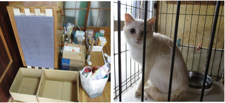 - 頭数のわりにトイレが小さく爪とぎの場所がなかったため、ボランティアが指導し、トイレは大きなもの、爪とぎも数か所に設置。寝床となる段ボール箱のベッドを複数設置したことにより飼育環境が改善された。