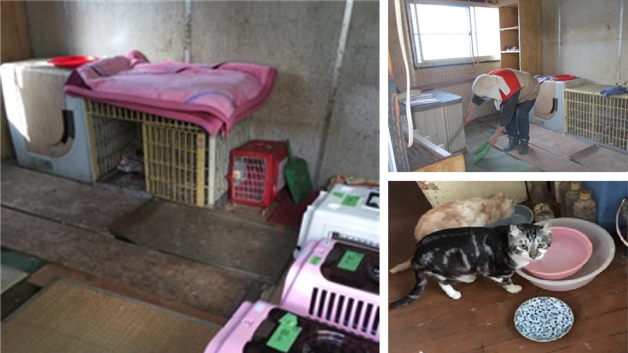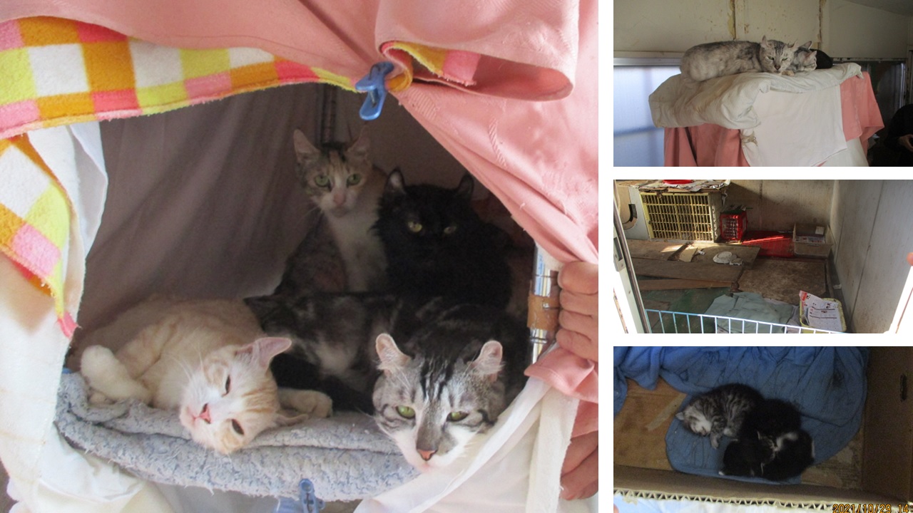 - 支援時、倉庫に空いていた穴を修復し、猫の居住スペースには毛布を複数枚かけて寒さ対策を行った。また、トイレの数を増やして散らかっていたゴミも片付けた。