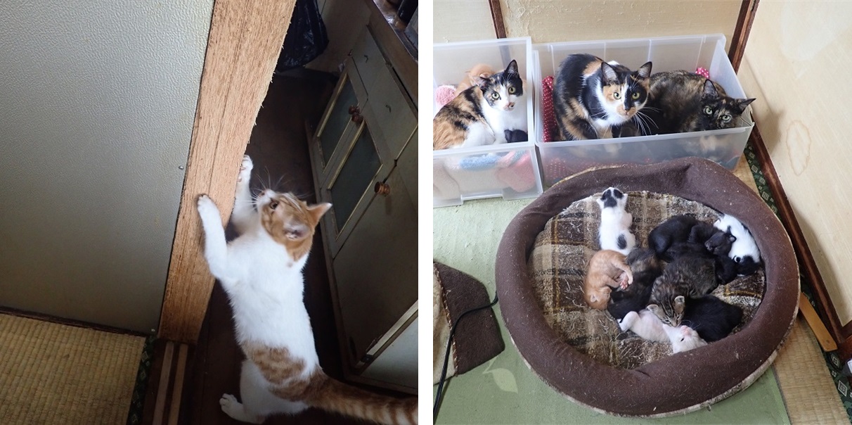 3. 近所の住民に猫を譲渡するなどの努力はしていたが、春が近づきメス猫が次々に妊娠・出産。子猫が15頭となった段階で対応できなくなり、担当のケースワーカーが市へ相談。