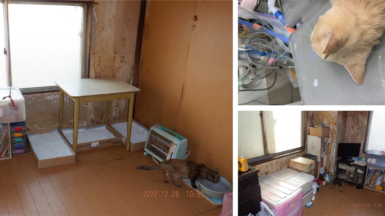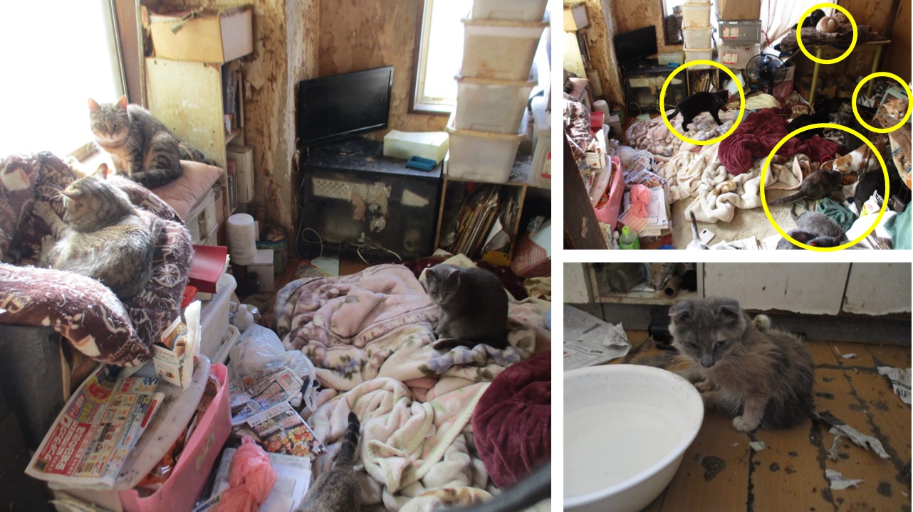 - 2018年ごろから30頭以上の飼育状態である。不妊手術をせず放置したことによる室内での近親交配、新たな野良猫の保護等による。