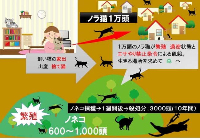 ノネコの生息数は600頭から1000頭なのに、駆除、殺処分する猫の数は3000頭と発表。環境省によると人の生活圏に棲む1万頭といわれるノラ猫が森に入ってノネコになり繁殖し増加するその合計が10年で3000頭ということです。