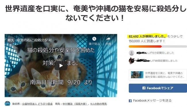 8万人の反対署名を集めた署名サイトChange org. [世界遺産を口実に、 奄美や沖縄の猫を安易に殺処分しないでください! ]