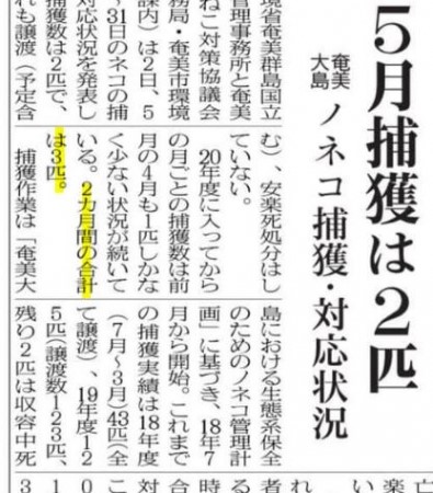 感染防止のため「島に来ないで!」と来島自粛、 外出自粛を呼び掛けている奄美大島で、 統計的根拠を欠いた奄美のネコ3000頭駆除が続けられています。 これまで環境省は168頭の猫を駆除しましたが、 そのうち33頭は飼い猫でした。 またアマミノクロウサギ、 アマミトゲネズミなどの希少種を含む野生動物の誤捕獲は1023体と猫の捕獲数の6倍、 しかもアマミトゲネズミ2頭を含む10個体程度が事故死していることがわかりました。 なお捕獲された猫は行政の指定した獣医による手術事故等で2頭が死亡しています。