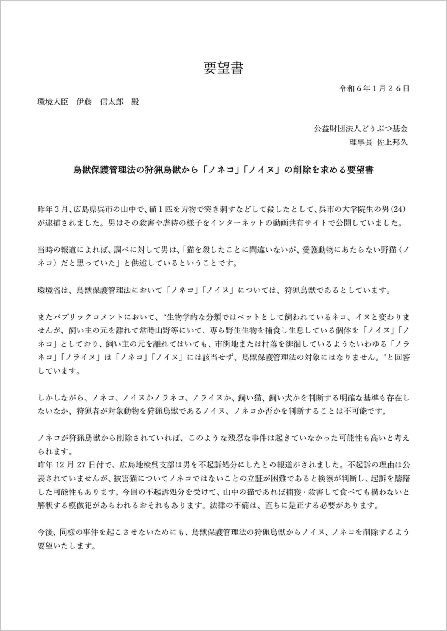 2023年1月26日、公益財団法人どうぶつ基金(以下「どうぶつ基金」)は、伊藤信太郎環境大臣宛に「鳥獣保護管理法の狩猟鳥獣から「ノネコ」「ノイヌ」の削除を求める要望書」署名47,284筆を一次提出いたしました。