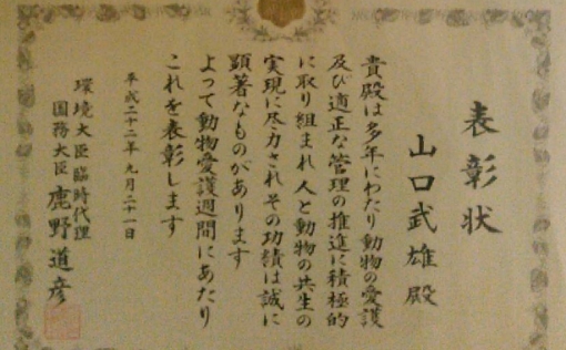 - 山口武雄前代表 動物愛護功労者環境大臣表彰受賞