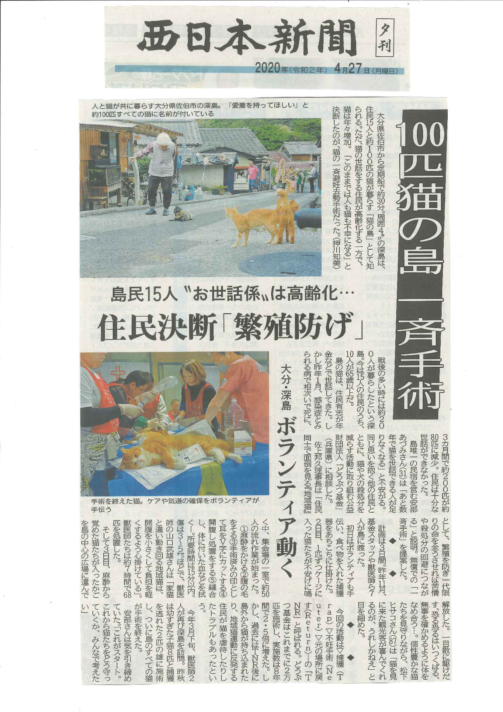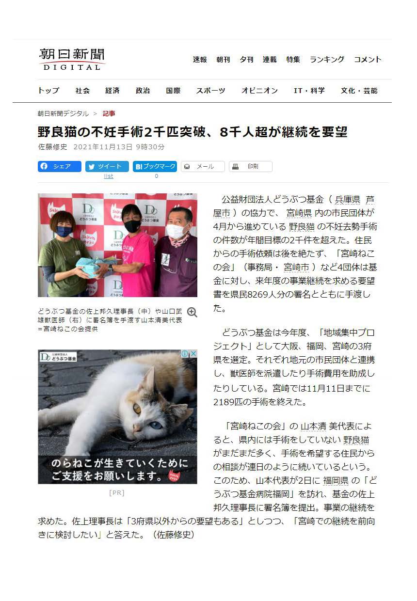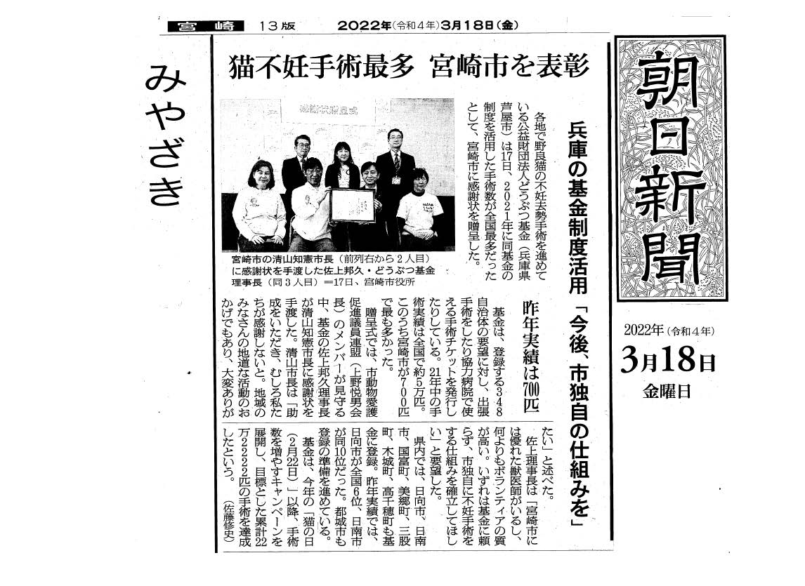 野良猫2千匹超不妊手術へ どうぶつ基金と宮崎ねこの会