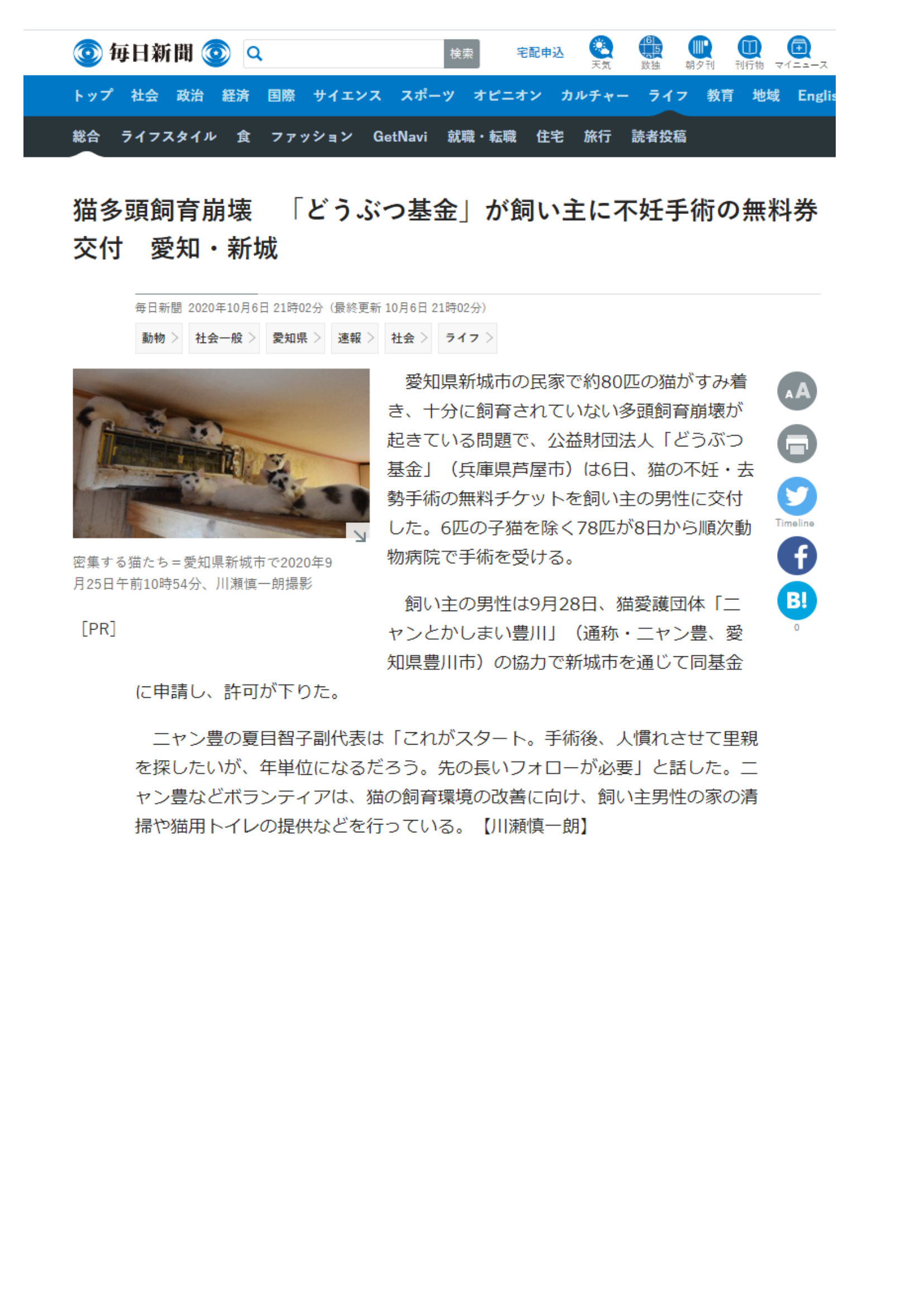 猫の多頭飼育崩壊を防ぎたい 不妊去勢手術、基金で自治体支援